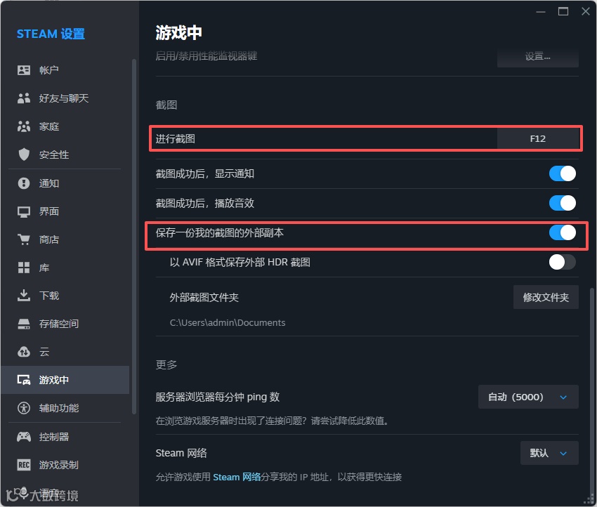 在steam里打开设置--游戏中--截图选项,把最后一个“保存一份截图至外部副本”打开。