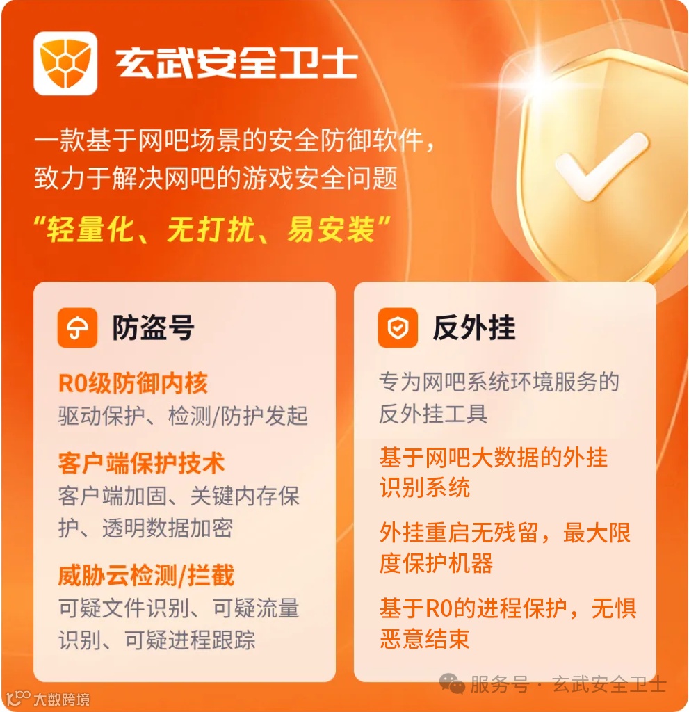 玄武安全卫士致力于打造网吧场景客户端安全防御,提供国服和外服游戏平台账号数据防护的安全软件。玄武安全卫士以“纯净、轻巧、专业“的安全防御能力获得了网吧用户的一致认可,在主流游戏防盗号及反外挂领域积累了丰富的经验。