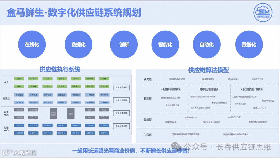 为支撑上述商业目标,盒马构建了“三点三段”数字化供应链结构,通过高效协同与智能决策,打造在生鲜、日百等品类上的高品质、高确定性与高效率的综合竞争力。