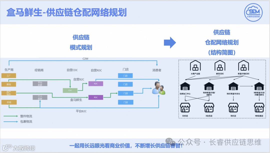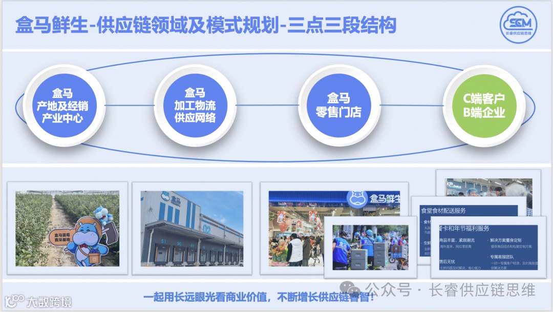 盒马采用“三点三段”供应链结构,支撑B2C与B2B直营零售、线上线下全渠道履约,实现产、供、销一体化运营。