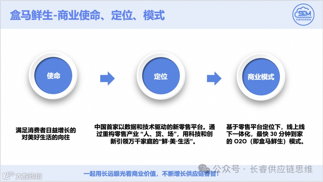 盒马鲜生定位为新零售平台企业,核心商业模式是线上线下全渠道一体化,提供“3公里30分钟到家”的末端配送服务。该模式对供应链提出更高要求:买得到、买得好、买得方便快捷、买得放心、买得开心。