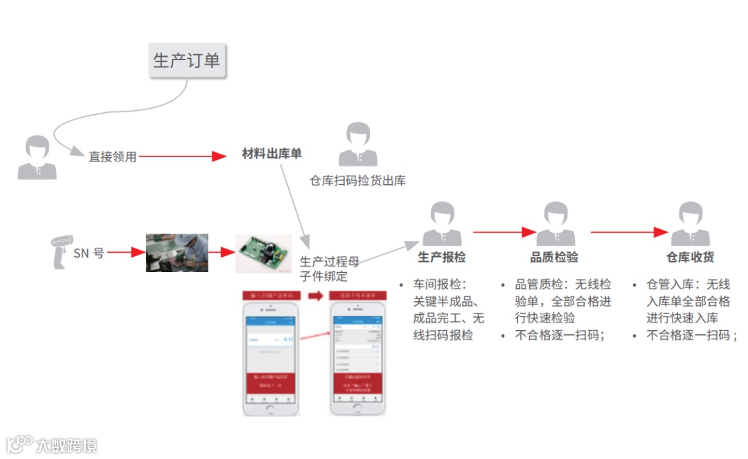 条码管理(全程条码管控,实现采购环节、质量管理环节、领料环节、生产组装环节、完工入库、发货、现场审计稽核及条码综合业务查询)、业务执行过程精细化管控;