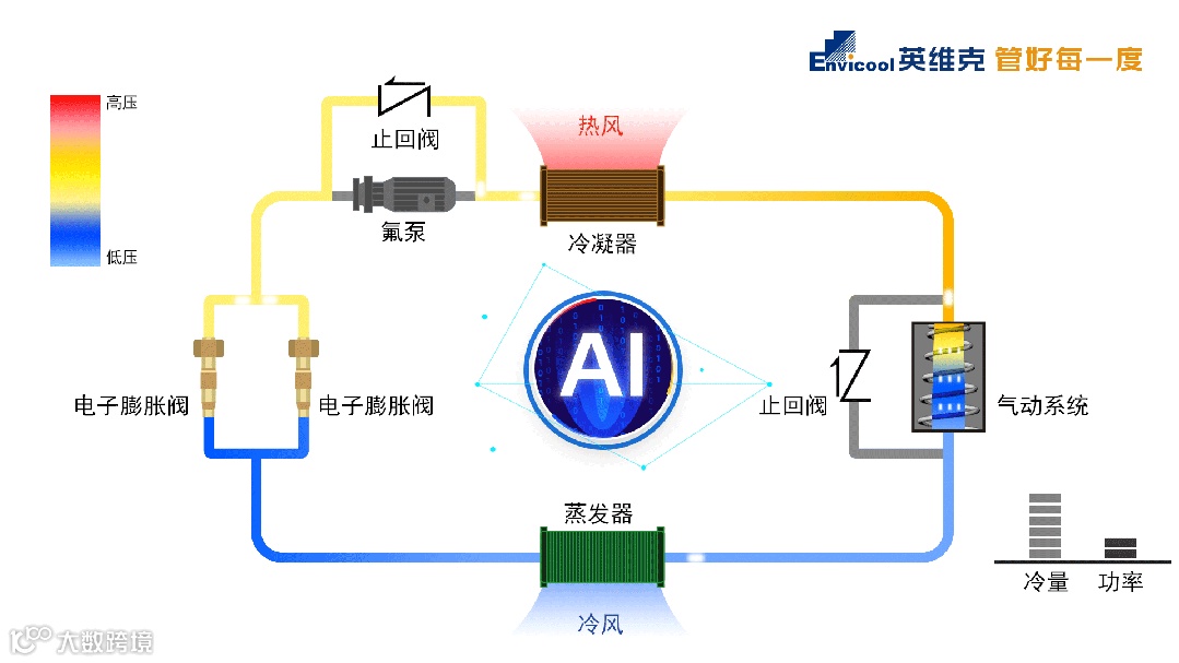 英维克XFreeCooling高效变频气动热管技术含压缩机、气动热管、氟泵三大运行模式,实现制冷系统可根据室外温度变化自适应切换运行模式,灵活适配空调系统。