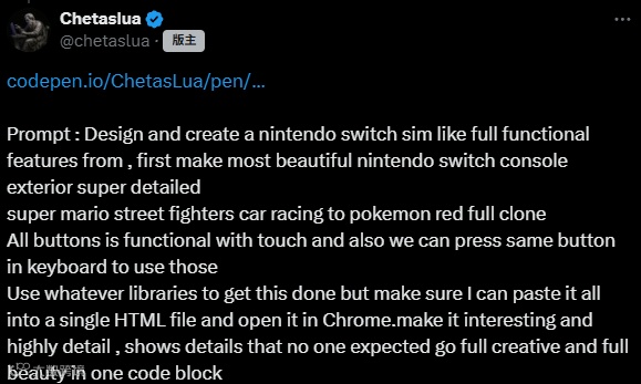 • 提示词的成功:Reddit 社区的演示证明了 Vibe Coding 的强大。有人用一段简单的英语提示词,让 Gemini 3 Pro 生成马里奥游戏,虽然游戏本身很简陋(几乎不能玩),但它在模仿 Switch 外观、以及捕捉旧控制台的感觉和艺术眼光方面表现惊人。