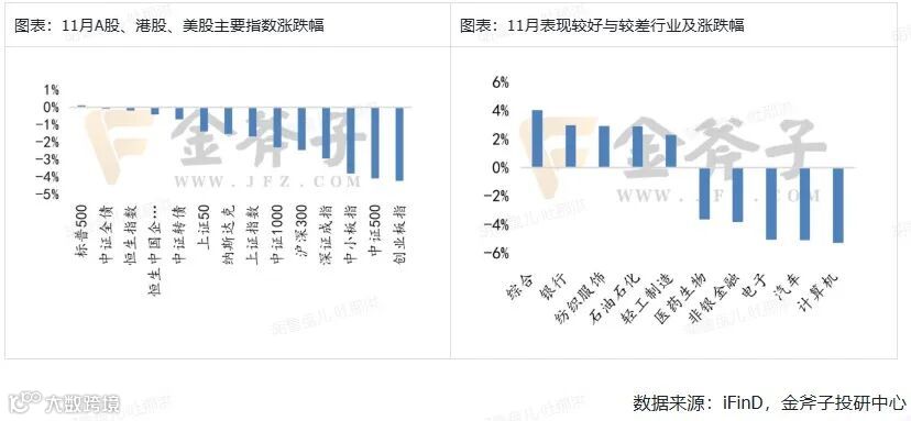11月全球市场表现均较弱,重要股指普遍下行。其中港股相对抗跌,美股标普500由于持仓更广泛相对收涨,A股结构分化。美股市场上美国政府11月结束停摆,虽然9月相关数据依次公布但由于时效性滞后参考作用不大,而10月就业数据又被推迟至12月美联储议息会议后公布,降息预期参考因素减少,当前美联储官员内部鹰鸽对立明显,是否持续降息仍未可知。AI泡沫是11月美股下行的另一主要原因,由于电影大空头原型公开做空英伟达细节并抨击AI泡沫,IMF与高盛等机构也提示风险,科技股目前已占据标普500前十大市值的80%,一旦大跌将对美国市场产生巨大影响。但随着英伟达业绩披露,谷歌新模型推出以及特朗普签署国家级AI部署命令,目前板块担忧有所好转,仍需保持关注。