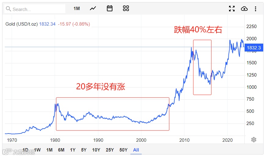因为如果再拉长数据来看,黄金的整体收益的确不错,但也有过20多年没涨过,跌幅40%的惨烈时期,如果你刚好在这个时期没拿住,那酸爽不敢想象。