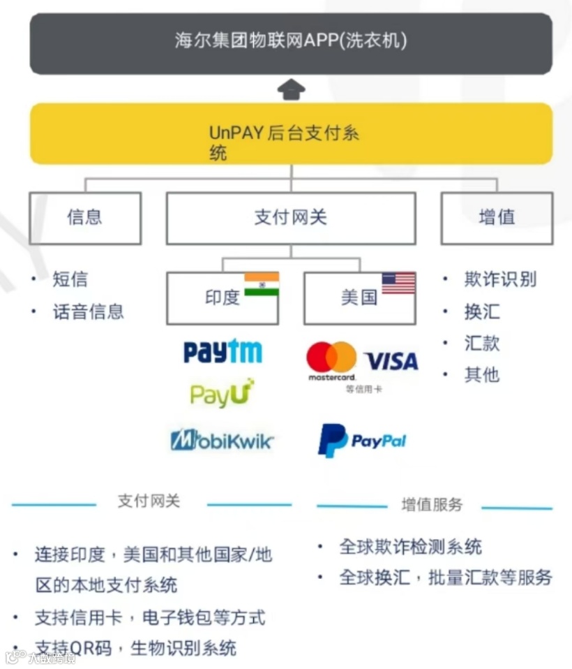 尤其是两国在数字货币领域的合作潜力。2018年,UnPAY就与海尔在印度展开战略合作,并在印度开设了首家物联网洗衣店。合作主要涵盖支付接入、支付生态引入和互联网营销等方面,旨在在印度以及其他海外市场推动物联网技术洗衣方案的普及,为全球用户提供智能便捷的服务。UnPAY提供了支付接入服务,在印度融合了Paytm、PayU、MobiKwik等本地支付通道,并配备了支付核心系统和智能收银台等C端交互模块。同时,UnPAY还提供完整的支付金融解决方案,包括账户管理、风险控制、外汇管理和转账付款等后续支付相关的服务,以协助其构建一站式支付管理平台。