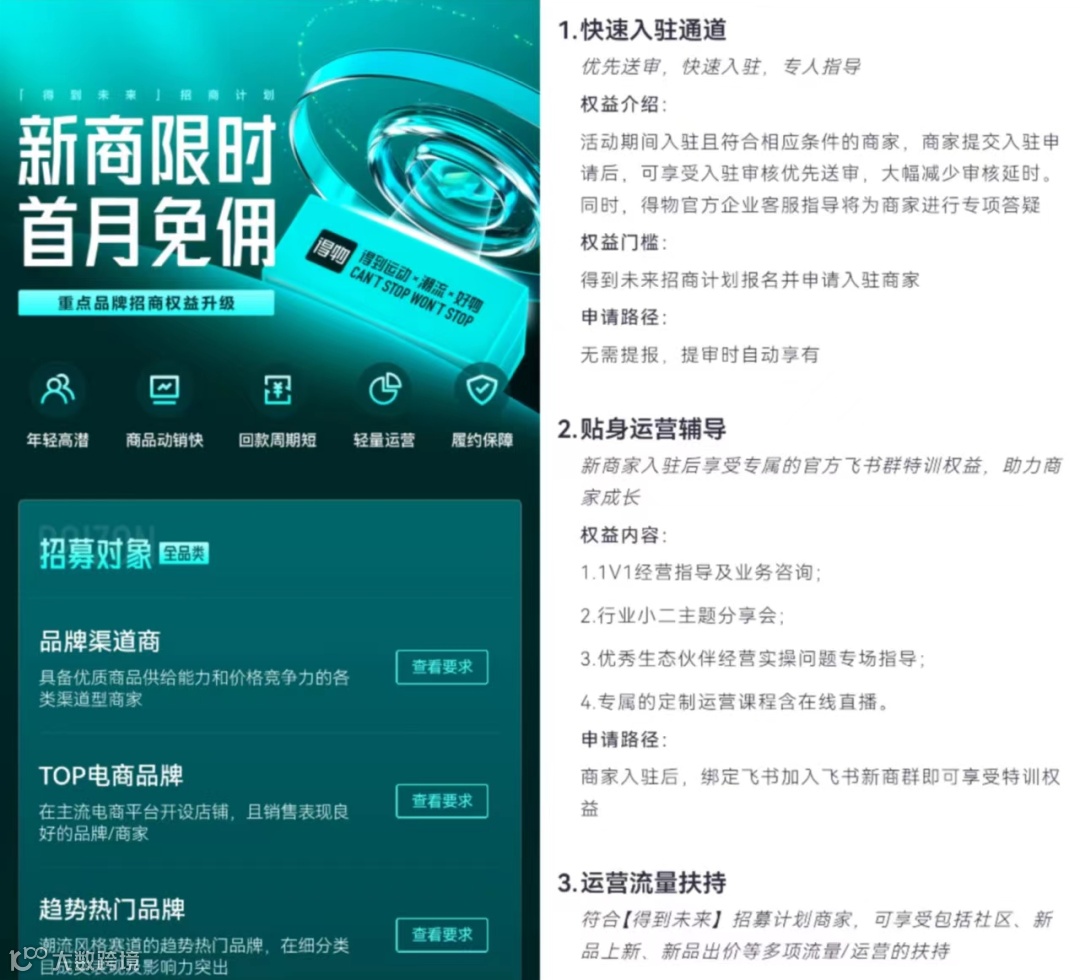 今年以来,潮流电商平台得物加快了招商的步伐,在去年新商计划的基础上,还升级了相关权益,提供最高30000元限时免佣激励、新品流量补贴、1V1新商扶持等。