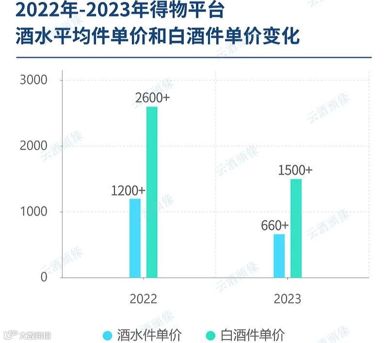得物酒水品类在2022年的件单价为1200元+,其中白酒品类的件单价高达2600元。即便2023年众多中低端酒水以及低客单口粮酒产品入驻,全年平台酒水件单价仍然超过了660元,而白酒件单价则在1500元以上。