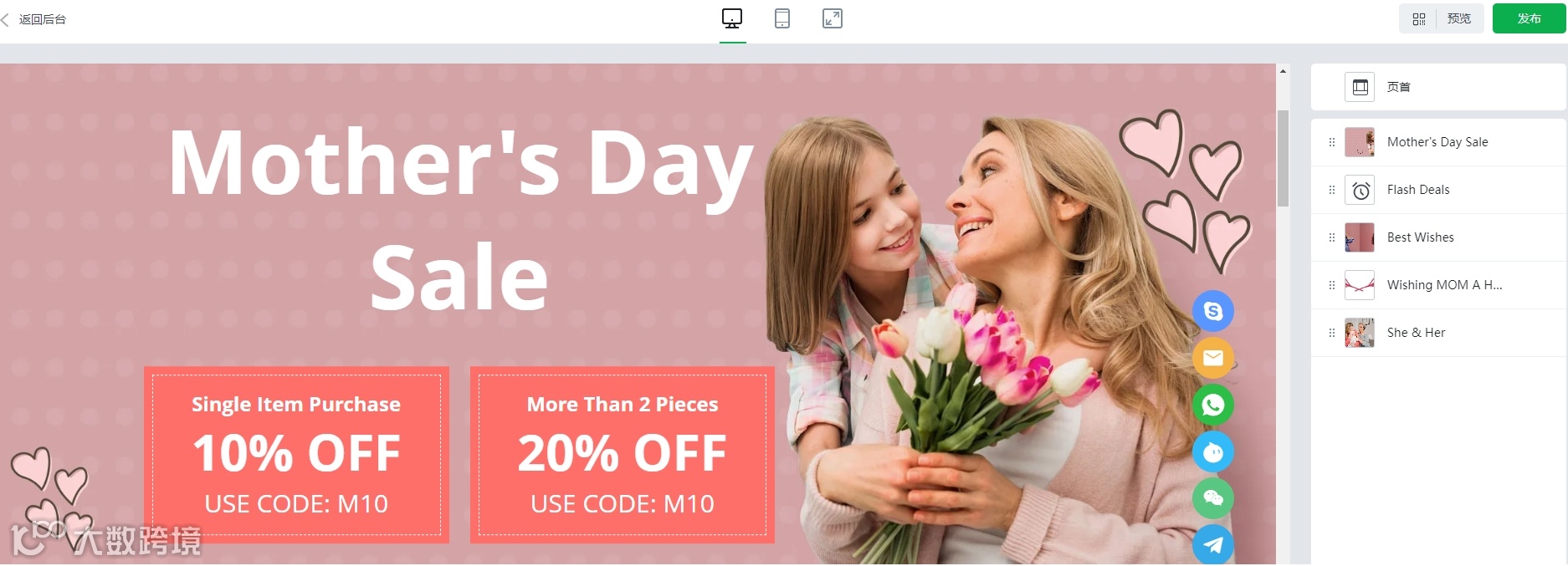 改变店铺装修:为店铺添加母亲节相关元素,比如说爱心、康乃馨等。卖家也可以通过Ueeshop落地页功能,快速创建母亲节促销界面,更换店铺主题,以营造浓厚的节日氛围感。