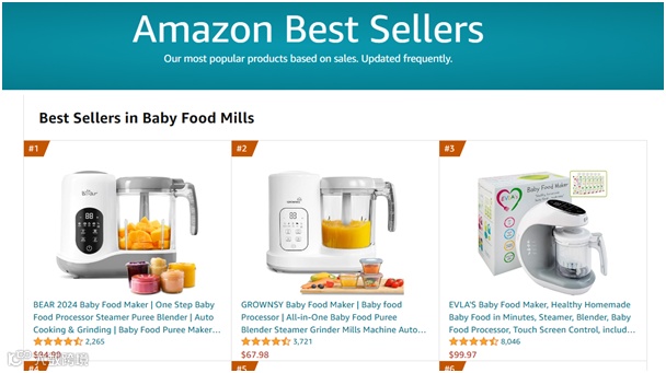在亚马逊婴儿食品粉碎机类目BestSellers 中,小熊电器的婴儿食品制作机产品排名第一。入选该类目的前几名都带有多功能合一的标签,在此基础上,小熊电器的产品进一步升级为触摸屏,制作食物的可选项多,不需要多余的拆分动作即可使用,操作更方便。