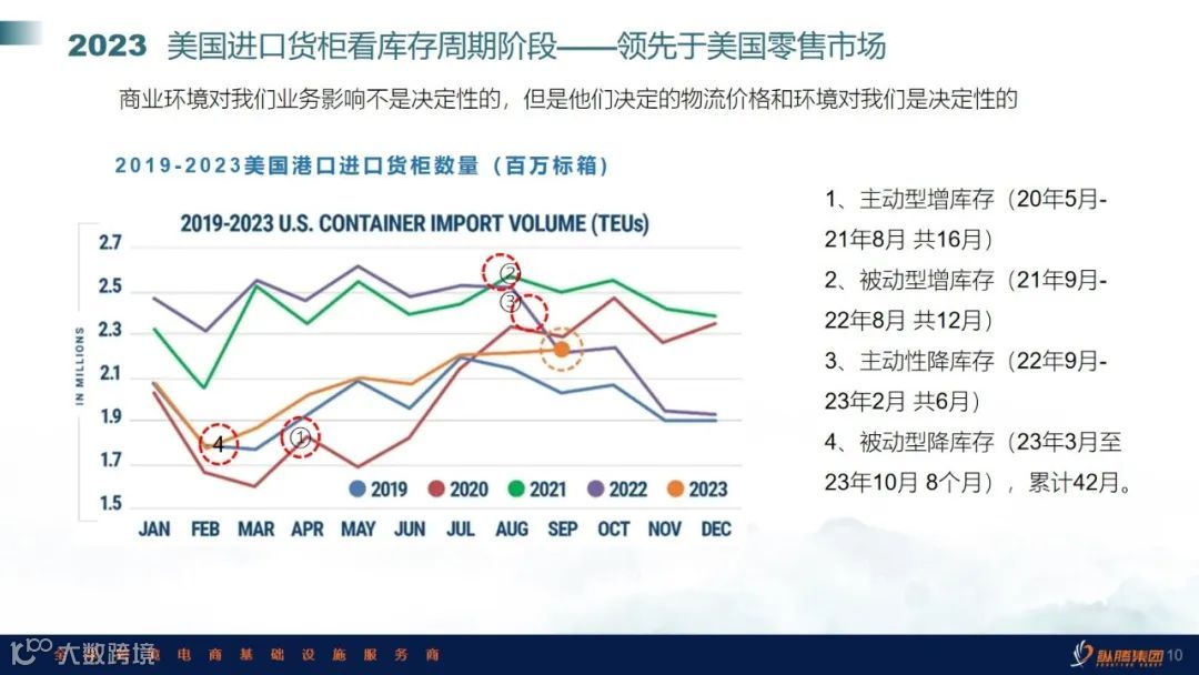 从美国的进口货柜数量来看,去年9月份的数据已经回到2022年9月份下跌前的水平,这表明美国的库存周期已经基本结束。一般来说,一个完整的库存周期大约为40多个月,而下一个周期也将随之而来。这对物流行业来说,意味着在库存周期的不同阶段,行业的生存状态也会有所不同,至少在一半的周期内,物流行业将会面临较好的市场环境。