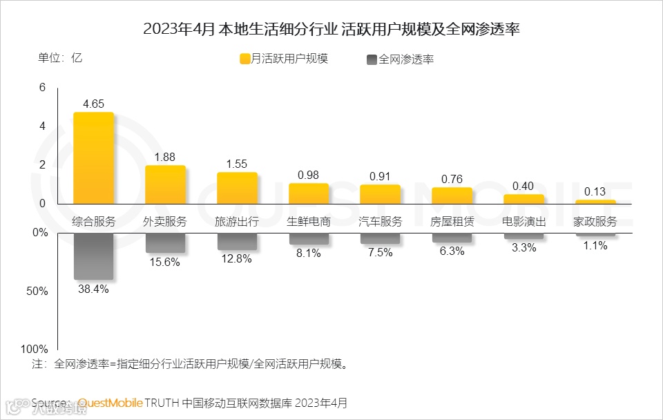 导读:QuestMobile数据显示,2023年4月,本地生活综合服务行业全网渗透率38.4%,即使作为重要支撑板块的综合服务(以团购为主),渗透率不到40%也意味着本地生活仍有较大的增长空间。