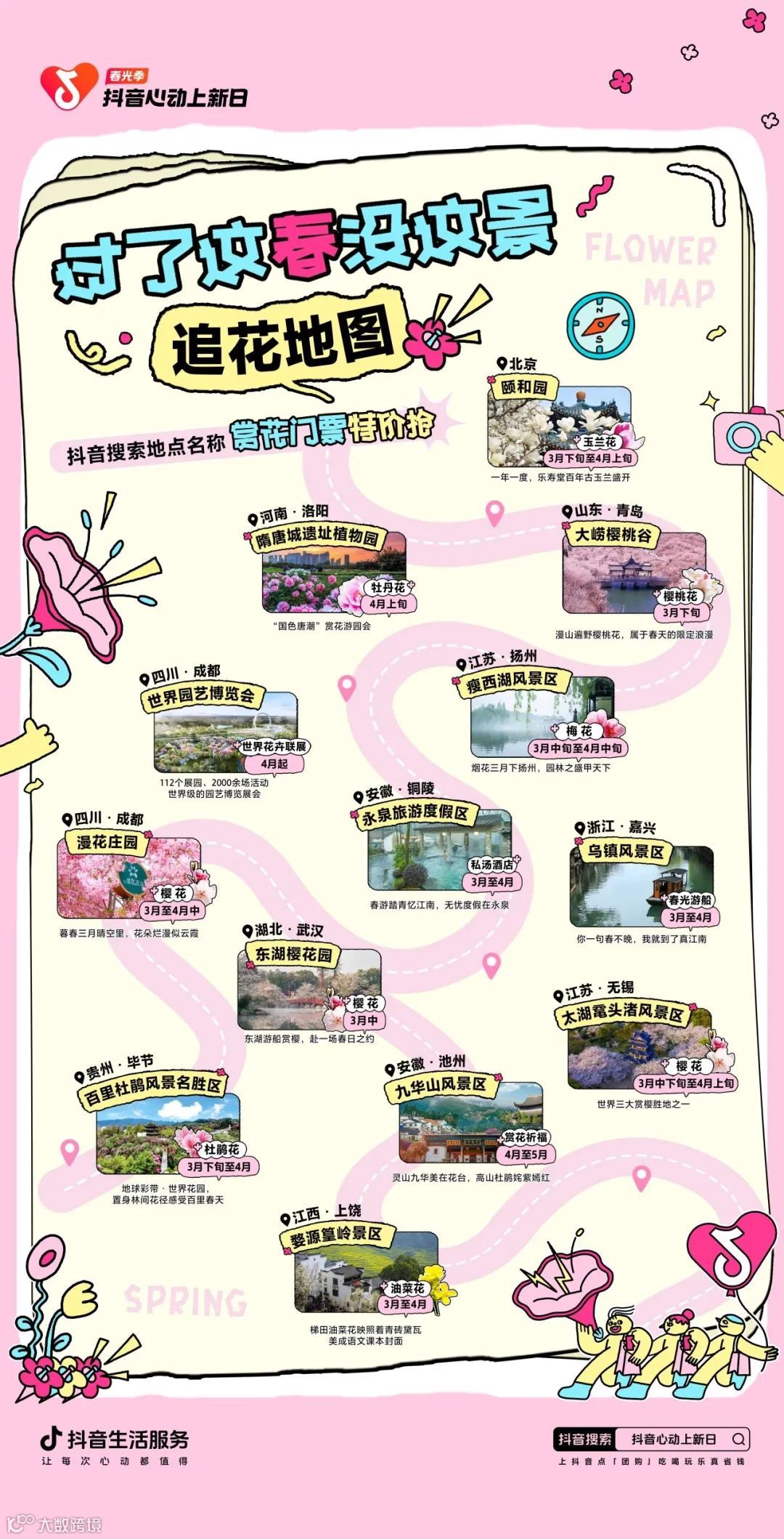 比如这个春天抖音生活服务的「抖音心动上新日·春光季」,不仅有主打低价策略的30+多品类直播间接力,也有关注各地风光的活动“过了这春没这景”。抖音还推出追花地图,将各地正值花季的各地景区呈现给用户。