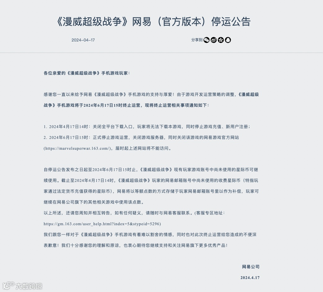 09、网易《漫威超级战争》手游官宣停运,余额以点数形式返还