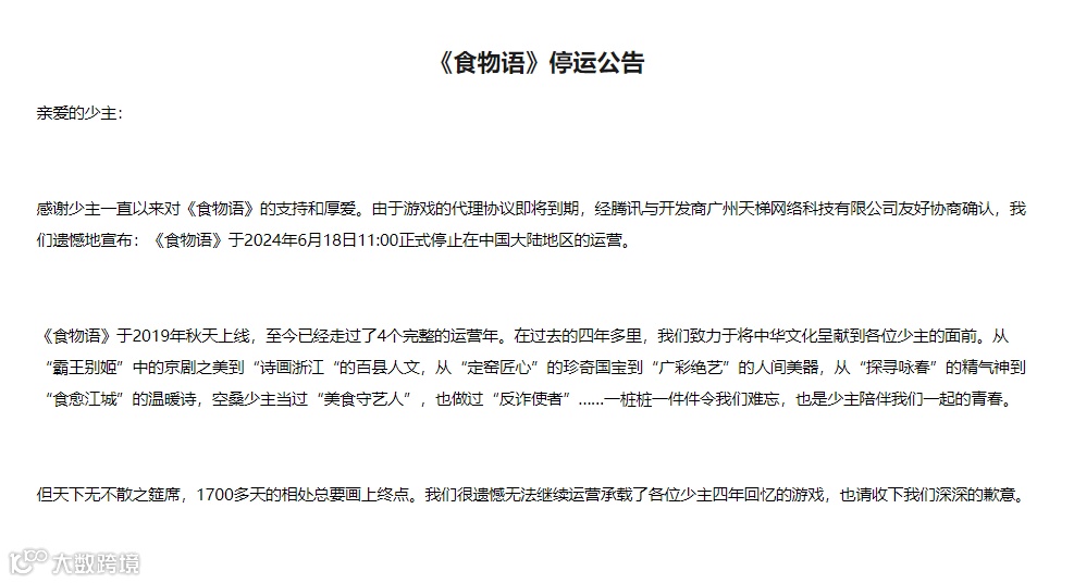 4月17日,腾讯游戏宣布,《食物语》将于2024年6月18日11:00停止在中国大陆地区的运营。这款中华美食拟人的国风女性向RPG养成手游自2019年9月3日公开测试以来,已走过了4个完整的运营年。