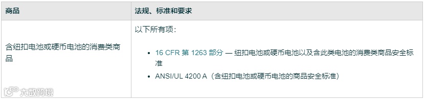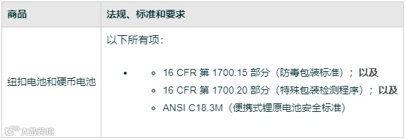 亚马逊要求所有含纽扣电池或硬币电池且属于 16 CFR 第1263 部分适用范围的消费类商品均经过测试并符合下列法规、标准和要求。