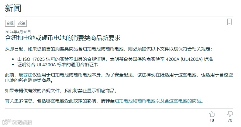 近日亚马逊美国站发布《含纽扣电池或硬币电池的消费类商品新要求》,要求如下:
