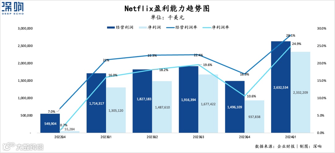 今日早间,Netflix公布了2024年第一季度财报,各项指标均超预期: