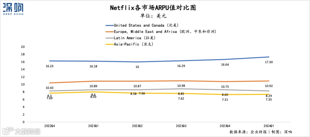 而再叠加上广告低价套餐对用户的吸引力,Q1Netflix的核心地区北美、欧洲中东和非洲市场实现了用户数、ARPU值的双增长。