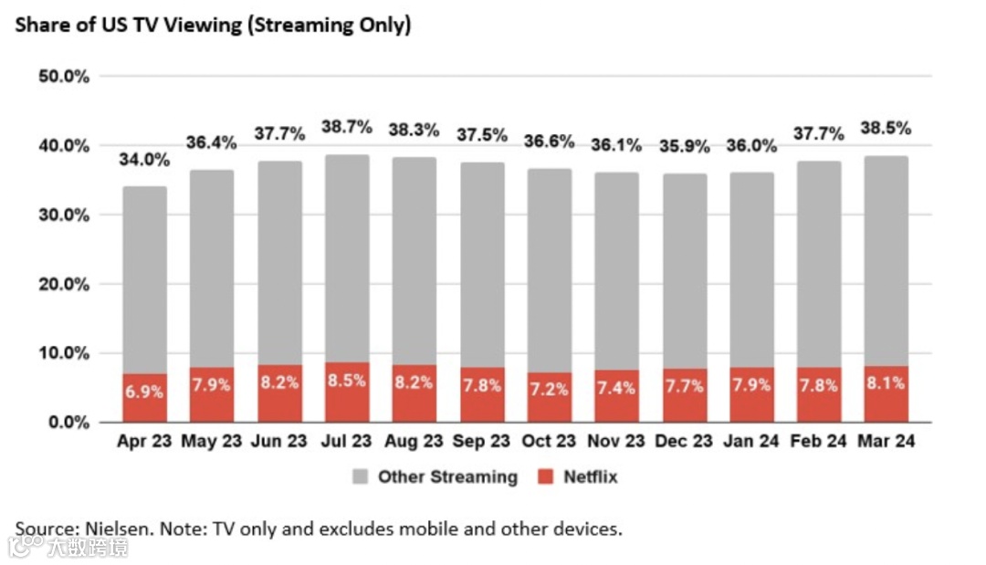 从客观数据上看,Netflix的用户参与度比较稳定健康——2024年第一季度每个账户的浏览时间与去年同期持平,根据尼尔森数据,在美国流媒体电视的观看份额中,Netflix的占比稳定在7%到8%左右。