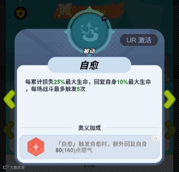 UR卢卡尔:被动奥义生命首次低于50%增加自身2%(4%)每秒生命回复。特技光束每击中一名敌人回复80%(160%)攻击的生命。烈击还是以输出为主,回复力为辅,可以选择性带受愈指令