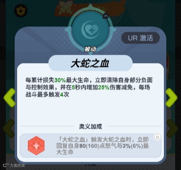 UR7级奥义大蛇:7级奥义属性首次受到致命伤害时,保留10%(20%)最大生命值