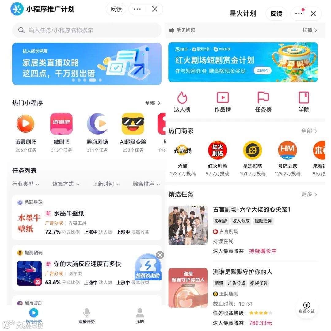 有粉丝数和剪辑能力的二创达人一边接商单赚分成,一边还收徒、收团队,赚个“课程费”;有短剧资源和达人资源的平台、MCN机构,做起了撮合服务商,赚中间的差价。抖音、快手都在站内上线了小程序推广计划,创作者满足1000粉丝条件便能领取任务;还有的第三方MCN机构也成立了独立的分发App,获得一批短剧授权后,签约达人和素人,按比例收钱,入局者包括快银、好省、熊猫等。