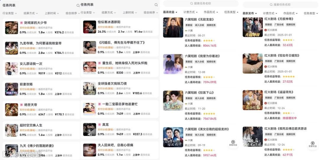 达人之外,抖音快手等短视频平台、第三方短剧分发App也给素人创作者“开源”,只要满足1000粉条件就能领取任务,创作者按比例分成,通常在0.9%到26.3%不等。以去年的一部爆款短剧《闪婚后,傅先生马甲藏不住了》为例,在小程序推广计划里有1.9万人投稿,个人最高收益1.1万。