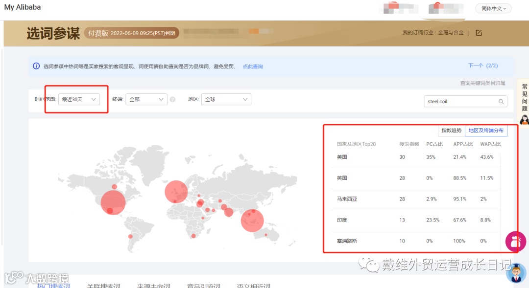 金品商家可通过“选词参谋”输入关键词查看主要市场分布。