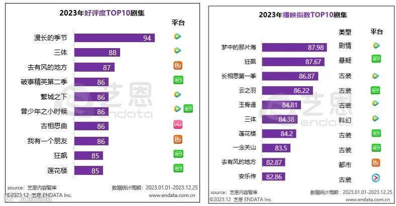 平台在尊重创作者的同时也收获了内容的正回馈。如艺恩数据显示,2023年播映指数Top10和好评度Top10中,腾讯视频各占四席,《漫长的季节》更是以9.4的豆瓣评分成为剧集年度口碑冠军。