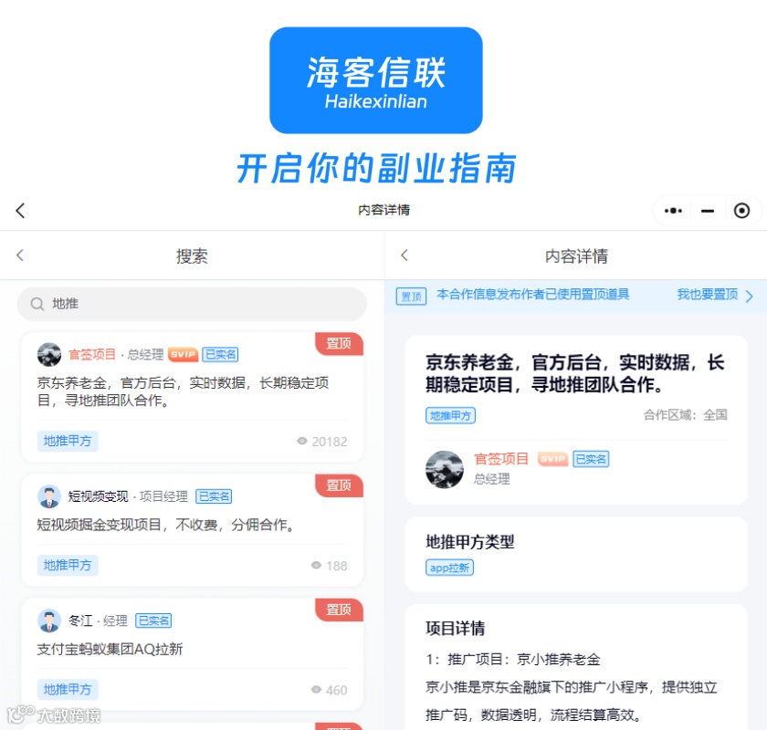 海客信联主打"商务资源精准对接",平台汇聚了海量地推、网推项目,支持供需信息即时发布。特色是能和项目方直接对接,适合需要稳定合作的企业团队和小白推广者。