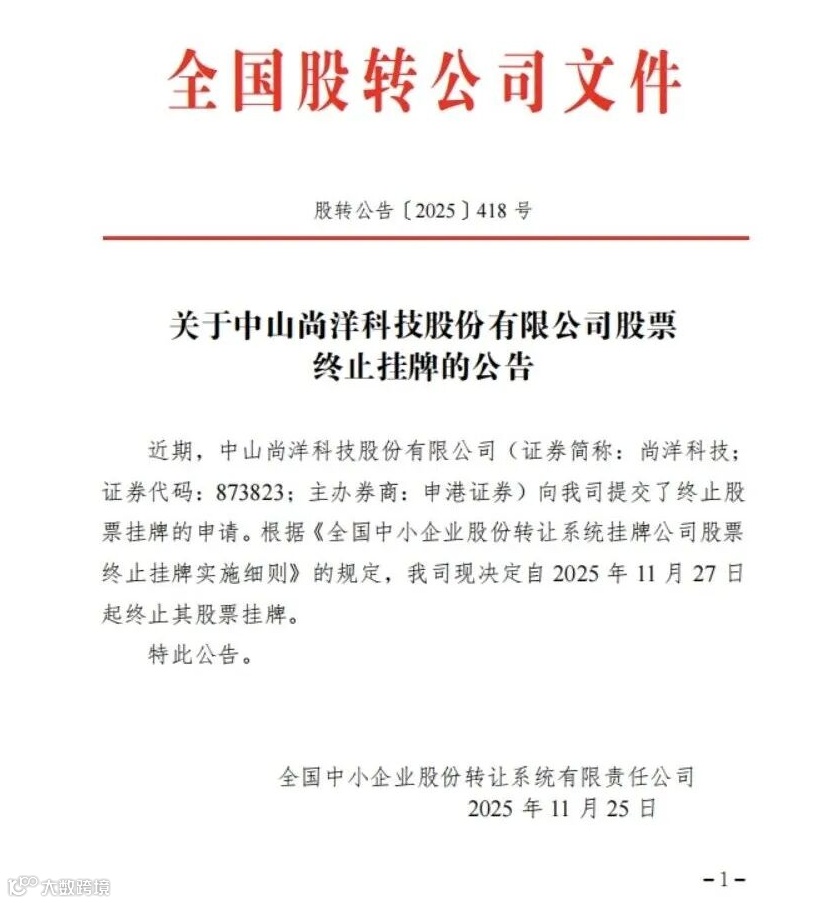 11月27日,中山尚洋科技股份有限公司(以下简称“尚洋科技”)股票正式终止在全国中小企业股份转让系统挂牌。至此,这家曾被称为“化妆工具第一股”的企业,再次结束了自己的资本市场旅程。