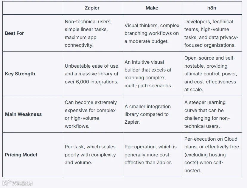 Zapier/Make 往往更“业务友好”,n8n 更“可玩性强”