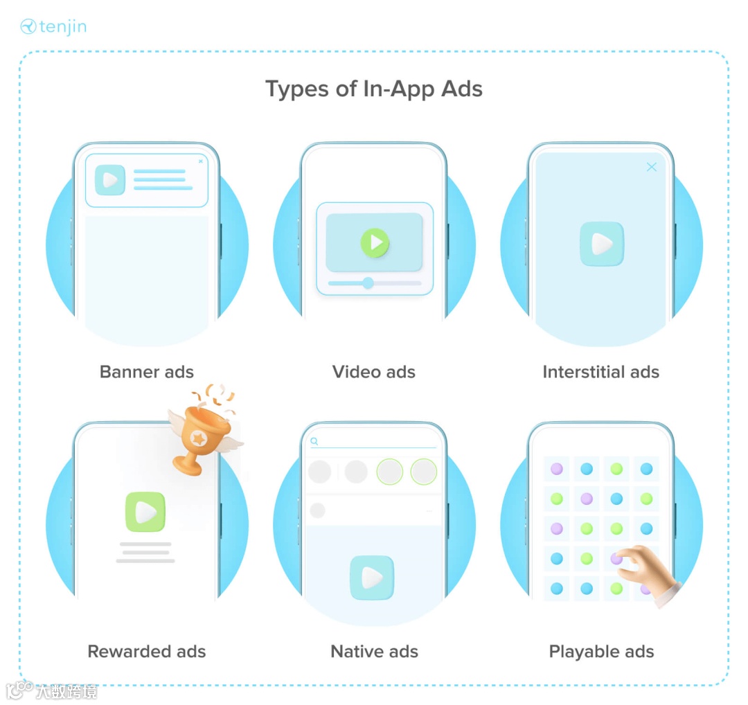 应用内广告(IAA)是指开发者通过在手游中展示广告来赚取收入的变现策略。使用IAA模式的游戏不是直接向用户或玩家收费,而是从广告主那里获得收入(广告主付费购买数字广告位触达游戏受众),常见形式包括:
