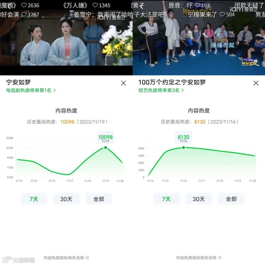 《宁安如梦》上线不到两周,站内热度破万,成为爱奇艺今年第四部破万剧;剧集断更期间它的衍生团综《100万个约定之宁安如梦》接档播出,上线第2天站内热度峰值冲破8000。