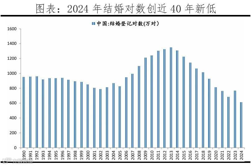 3、不婚化加剧,由于年轻人口减少、结婚成本过高、婚姻观念改变等,2024年全国结婚登记610.6万对,较2023年减少157.6万对,降幅为20.5%。