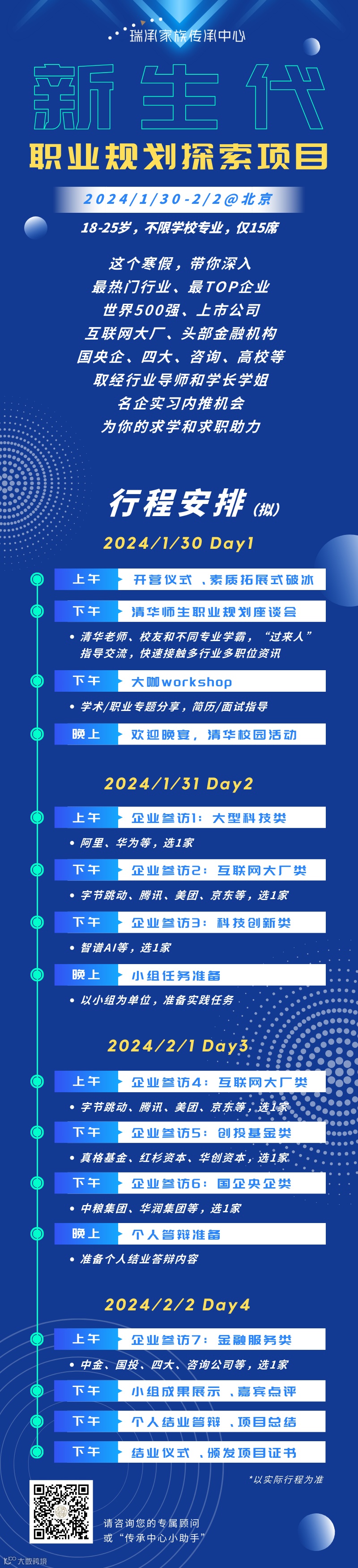 传承中心独家打造的“Youth Power新生代职业规划和探索项目”,整合多行业世界500强、上市公司、互联网大厂、顶级金融机构、国央企、高校等名企名校名师资源,4天多元沉浸式学习实践,帮助在校学生厘清发展方向,Get求职真相,成为复合型人才,交到好朋友,开眼界、学真知、明方向,有力量!