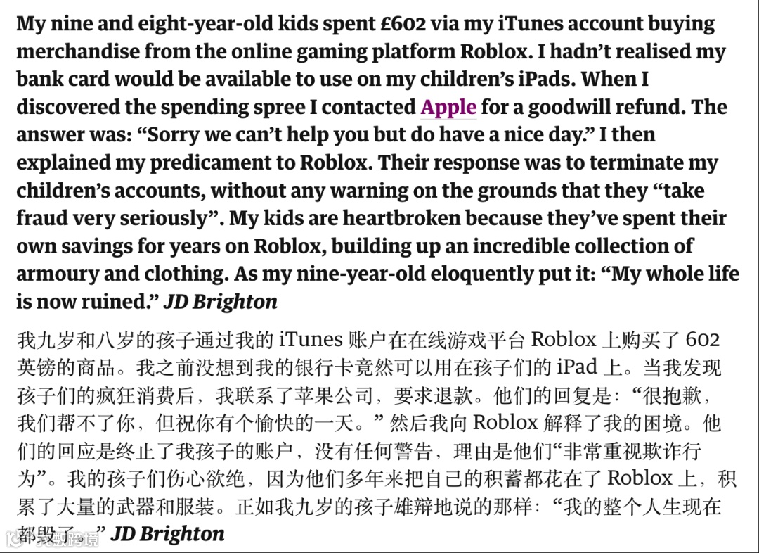 这事不是孤例,两个月后,卫报报道说有两个娃在 Roblox 上买了 602 英镑的商品,家长发现后要求退款。