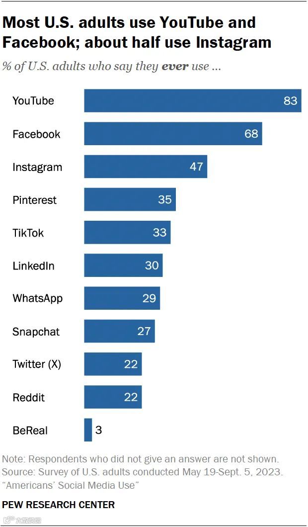 其他被调查的网站和应用虽然使用率不如上述平台广泛,但仍有一定数量的美国人在使用:27%至35%的美国成年人使用Pinterest、TikTok、LinkedIn、WhatsApp和Snapchat。