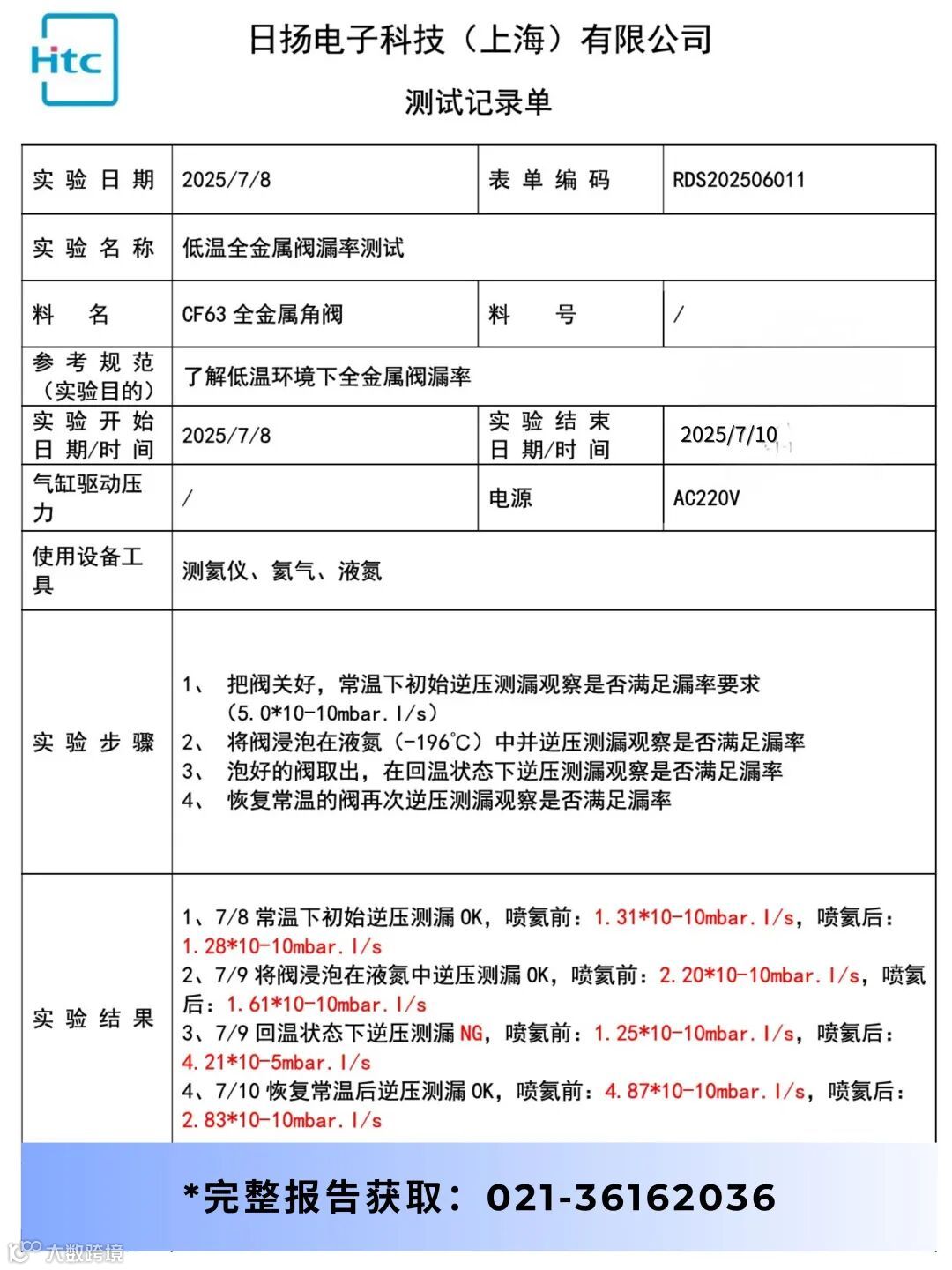 HTC全金属角阀在开启状态下通过400℃,关闭状态下300℃的高温测试,其密封性能达标。此外,日扬科技还做过可复现的-196℃极限低温测试,通过喷涂和浸泡液氮,阀门工作状况正常,其漏率在性能参数范围之内。