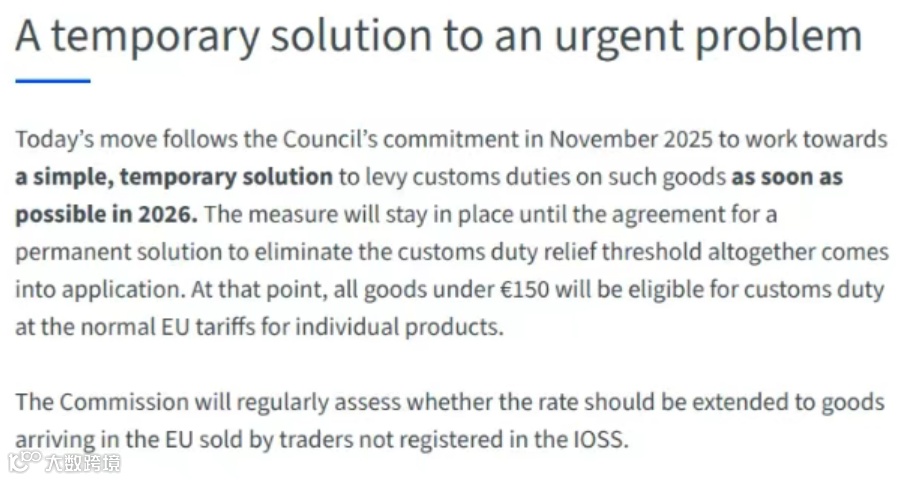 此项3欧元固定关税为过渡性安排。背景是欧盟已于2025年11月达成协议,决定永久取消150欧元进口免税门槛。