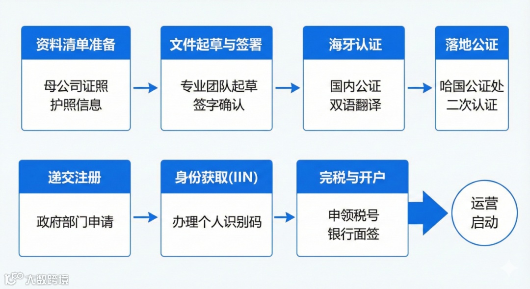 核心包括:母公司全套证照(执照、章程、简档)、法人的护照信息,以及拟任哈国公司负责人的护照。