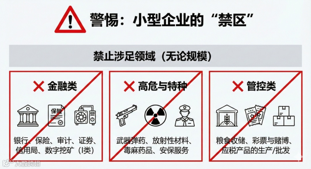 ❌ 管控类:粮食收储、彩票与赌博、应税产品的生产/批发。