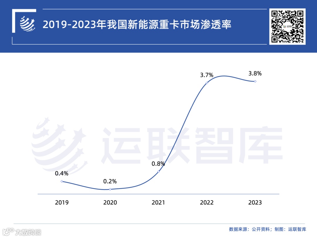 首先,新能源重卡近年来的渗透率逐渐提升。2023年,新能源重卡渗透率上升至3.8%,对比2019年的0.4%来说,整体渗透率有大幅度的提升。未来随着新能源重卡销量持续增长,市场渗透率将会进一步增加。