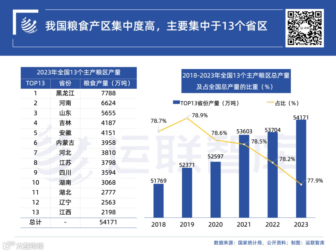 从产区的集中度来看,整体而言我国粮食产区集中度非常高。我国13个粮食主产区的产量占全国总产量的比重,从2018年至2022年一直维持在78%以上。2023年下降至77.9%,则主要是受河南地区“烂场雨”天气影响。