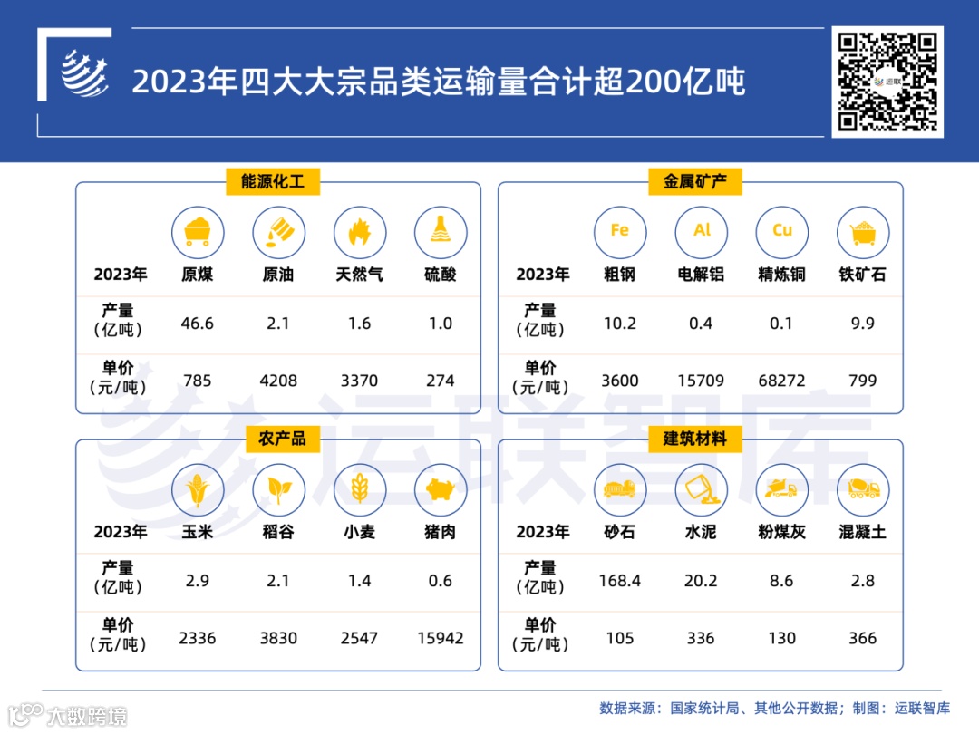 本文主要讨论煤炭、钢铁、砂石和粮食这四大品类。2023年,这四大品类的总运量超过200亿吨,在运输规模上大宗商品与普货存在量级差异。