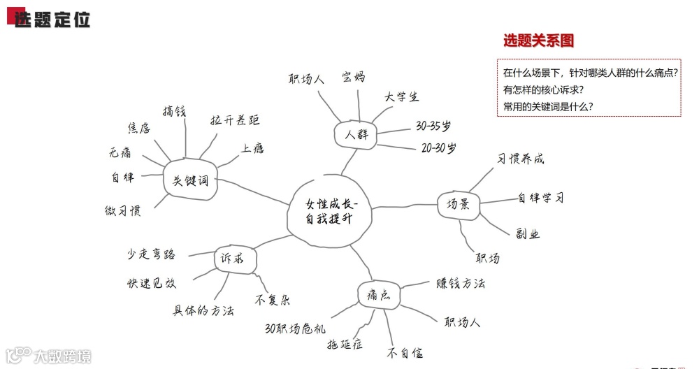 首先拿出一张A4纸,写下你要做的赛道(细分赛道),围绕赛道写下人群、场景、痛点、诉求、关键词,然后再细分罗列出所有与之相关的关键元素,尽量多的去写,写的越多选题角度越多,与观众的关系就越紧密。