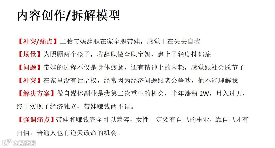 这样分析下来我们就能发现,会讲故事就是要讲与观众有利益相关的内容,并且要有相对完整的过程把观众代入到场景中,重新刺激他在当时场景下遇到的困难或者是苦恼的记忆。