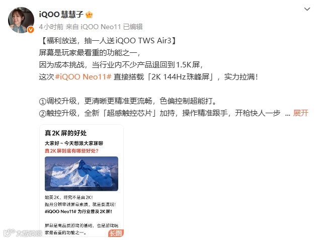 据介绍,iQOO Neo11配备2K 144Hz珠峰屏。